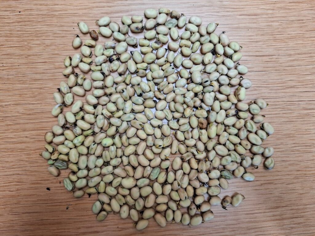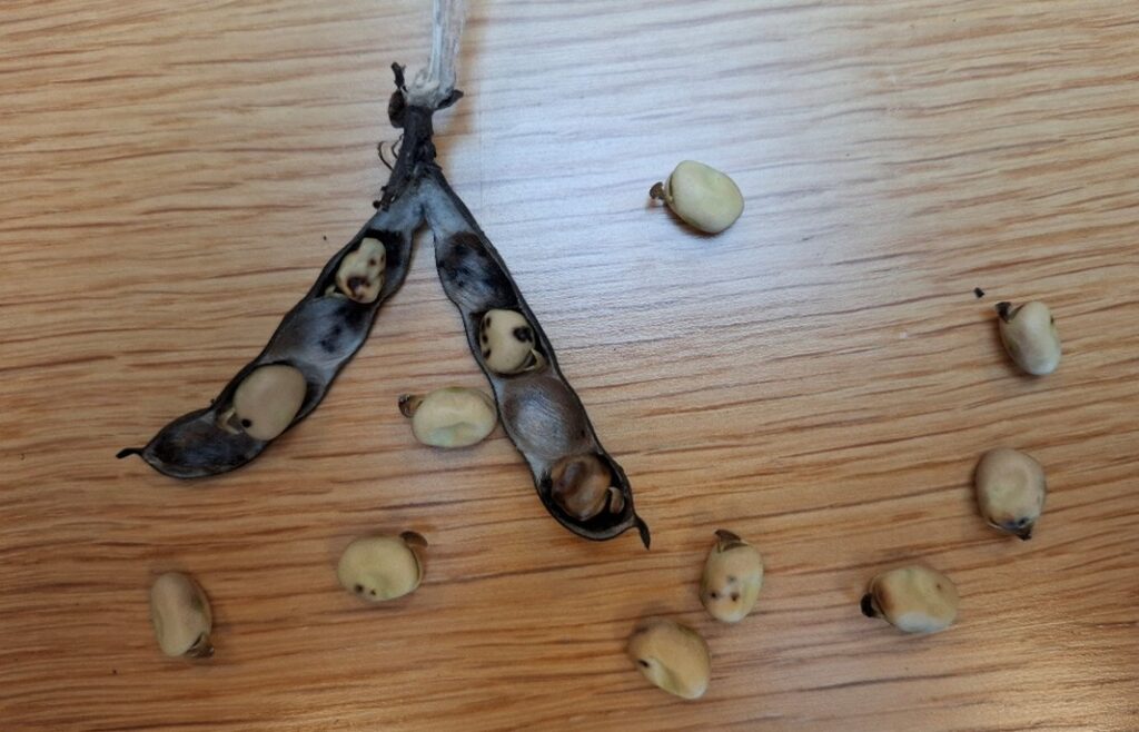 Billede 5: Der var stor forskel på, hvor angrebne bønnerne var. Ovenfor ses nogle meget fine og høstklar hestebønner med få angreb. Billede: Maia Vial