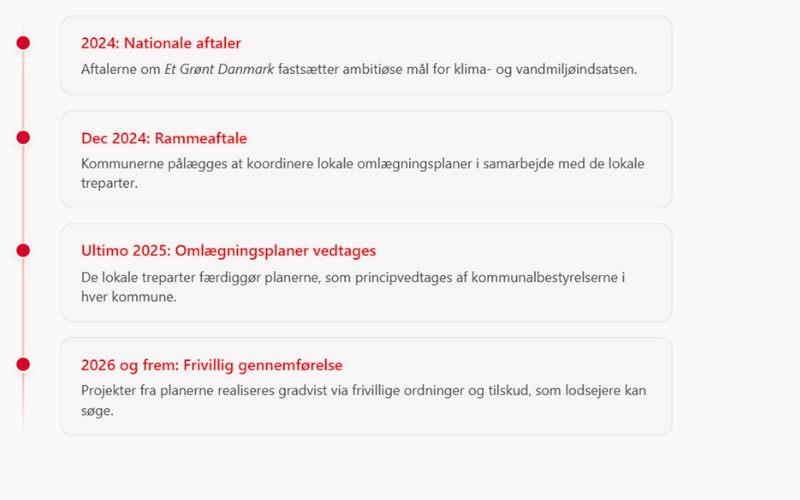 Hvis din jord er udlagt i den lokale omlægningsplan, behøver du ikke at foretage dig noget her og nu. Typisk vil kommunen eller et projektsekretariat kontakte dig, hvis der er konkret interesse i at starte et projekt på dit areal.
