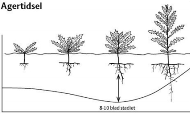 Billedet viser, på hvilket stadie agertidslen har opbrugt mest af dets næring i rødderne uden at have opbygget ny næring endnu. Dette punkt hedder kompensationspunktet og er ved 8-10 bladstadiet. Det er her, du får mest ud af at ramme tidslen med harven eller ploven.
