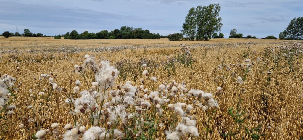 På billedet ses en havremark med tidsler. Tidslerne er nemme at se, mens de blomstrer. Det er derfor et ideelt tidspunkt til at finde ’problem-arealerne’.