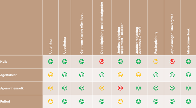 Følgende skema er udarbejdet af Innovationscenteret for Økologiske Landbrug og giver et overblik over effekten af forskellige strategier mod kvik, agertidsler, agersvinemælk og følfod.