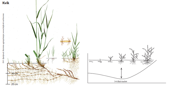 Figur 1: Viser underjordiske kvik plante med udløbere samt kurve for energidepotet i rødderne, som er ved sit laveste ved 3-4 bladsstadiet (Faktaark om kvik fra DLBR Dansk Økologi).