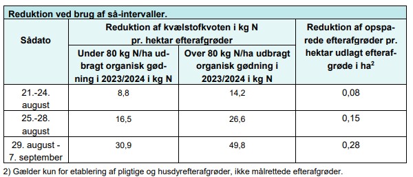 Det er mod en kvotereduktion muligt at så efterafgrøder til og med den 7. september. Tabel 1 viser reduktion af N-kvoten eller opsparede efterafgrøder ved forskellige så-intervaller.